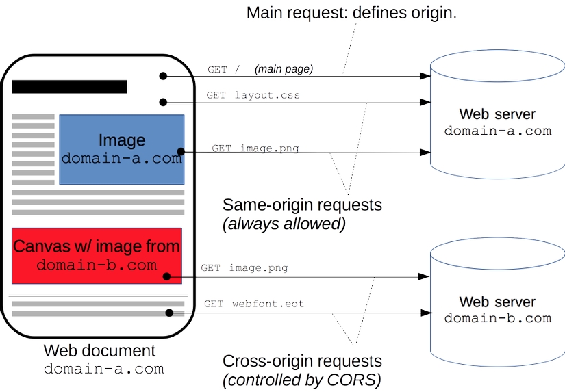 Trước khi có tiêu chuẩn về CORS, thì không có cách nào để một trang web gửi request thông qua trình duyệt đến một domain khác. Đó là một cơ chế trong trình duyệt có từ Netscape Navigator 2 (1995) gọi là Same Origin Policy, để hạn chế một document hay một script tương tác với tài nguyên không cùng một gốc hay origin. Hai trang web có cùng một origin là khi nó có chung protocol, port và host. Khác subdirectory cũng coi là khác origin.